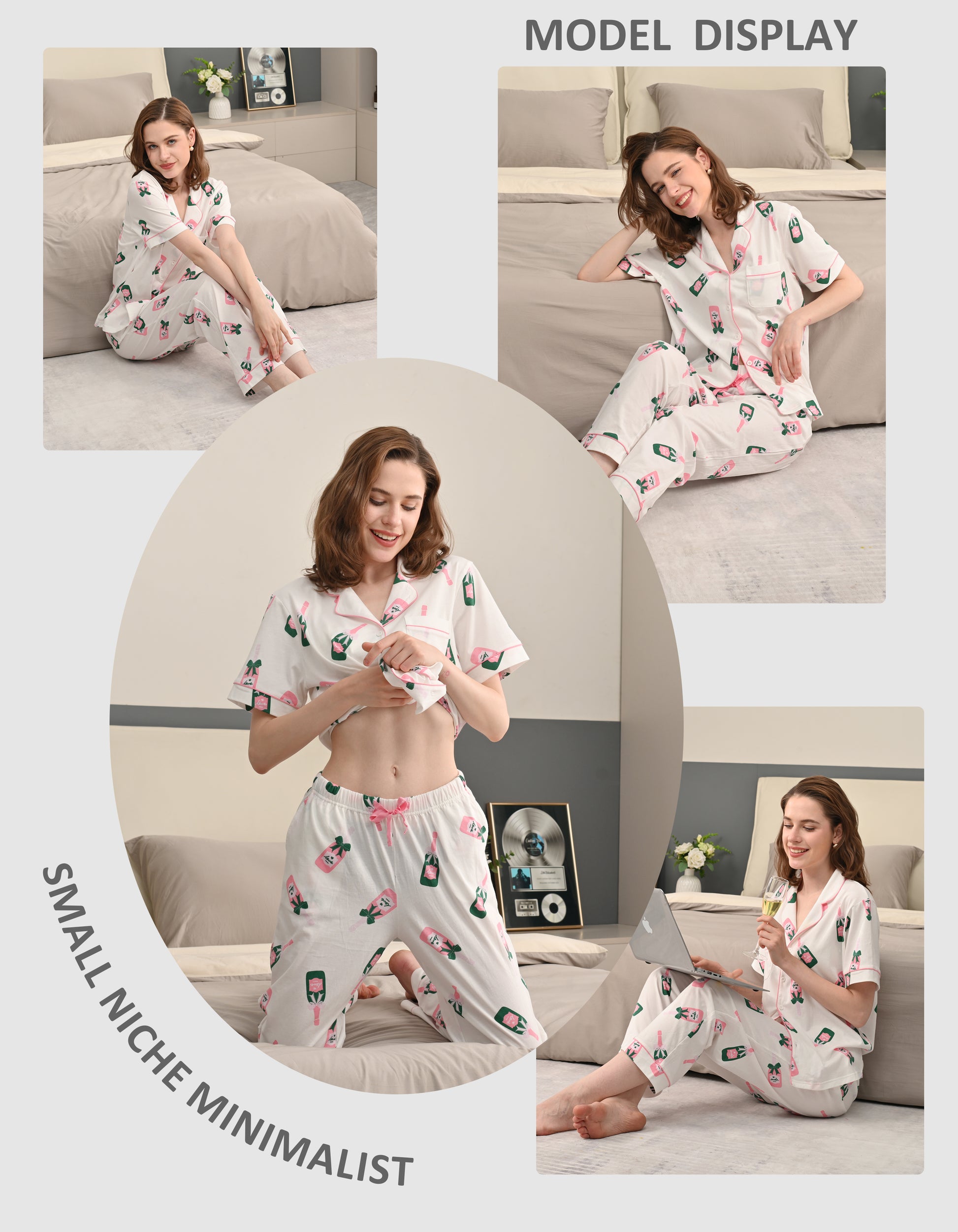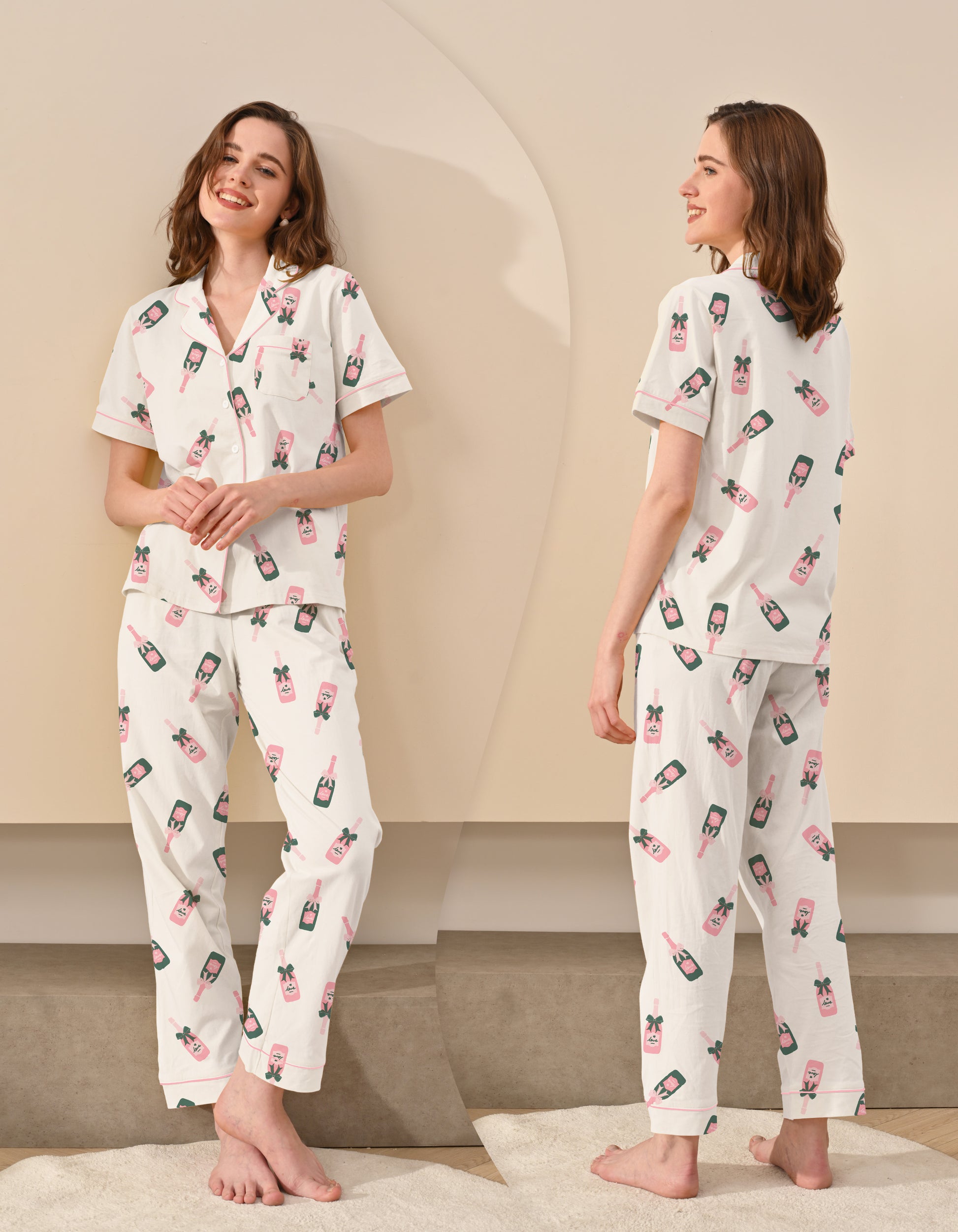 Women’s 100% Cotton Printed Pajama Set – Champagne Bottle Pattern, Short Sleeve Button-Down Sleepwear with Pants